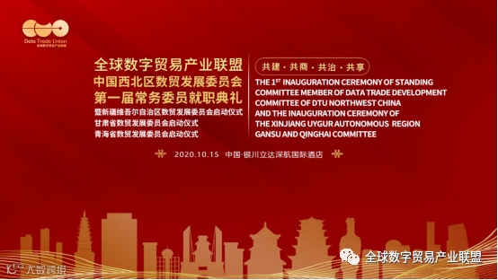 2020年10月15日,全球数字贸易产业联盟中国西北区数贸发展委员会第一届常务委员就职典礼暨新疆维吾尔自治区数贸发展委员会、甘肃省数贸发展委员会、青海省数贸发展委员会启动仪式在宁夏回族自治区银川市立达深航国际酒店盛大举行。全球数字贸易产业联盟中国区第四届常务委员姜惟瀚先生、全球数字贸易产业联盟中国区理事会理事长戚伟川先生、中国区理事会秘书长岳敏女士、中国西北区数贸发展委员会第一届常务委员及西北区委员、各省级委员代表和企业家代表共500多名企业家出席盛会。