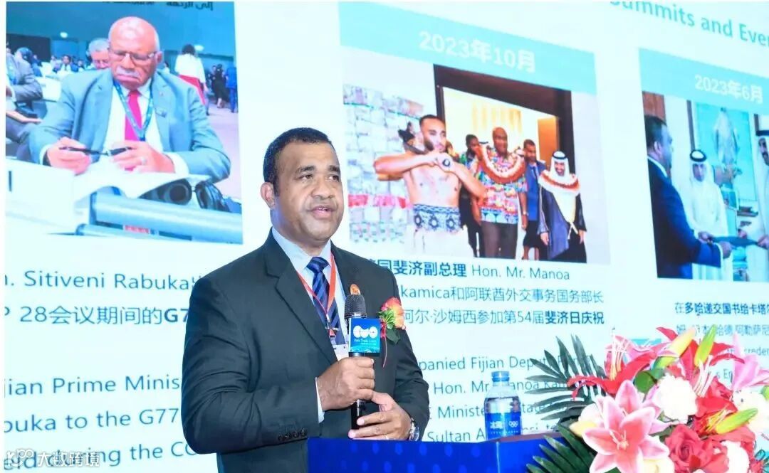 Katonitabua理事长首先向所有嘉宾表达了诚挚的问候和感谢,他回顾了自己作为前斐济驻阿联酋大使的丰富外交经历,特别是在中国任职期间与中国国家领导人的会面,以及在斐济与中东国家间的合作和联合国活动中取得的成果。