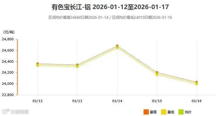 有色宝长江铝日均价周一至周五分别为:24340;24320;24660;24180;24010