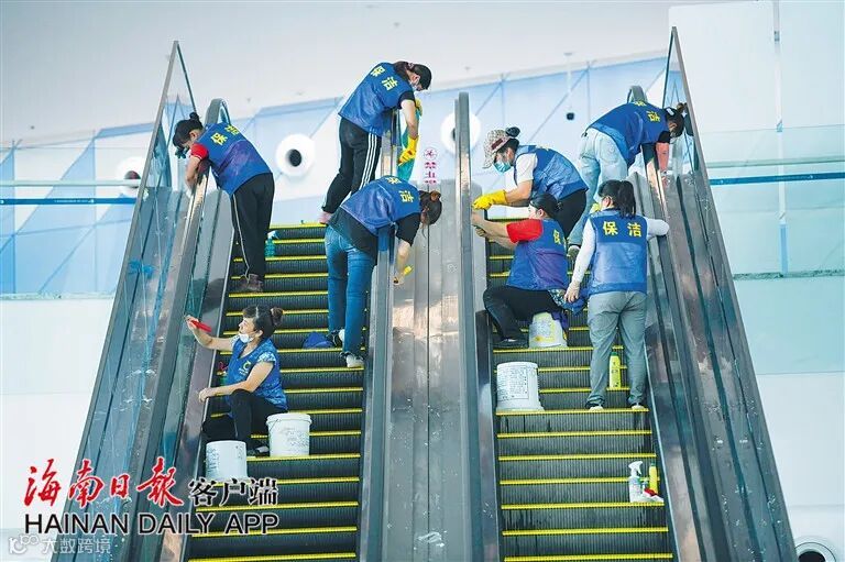 4月27日,在海南国际会展中心,保洁人员在清除电梯上的灰尘污渍。海南日报记者袁琛 摄
