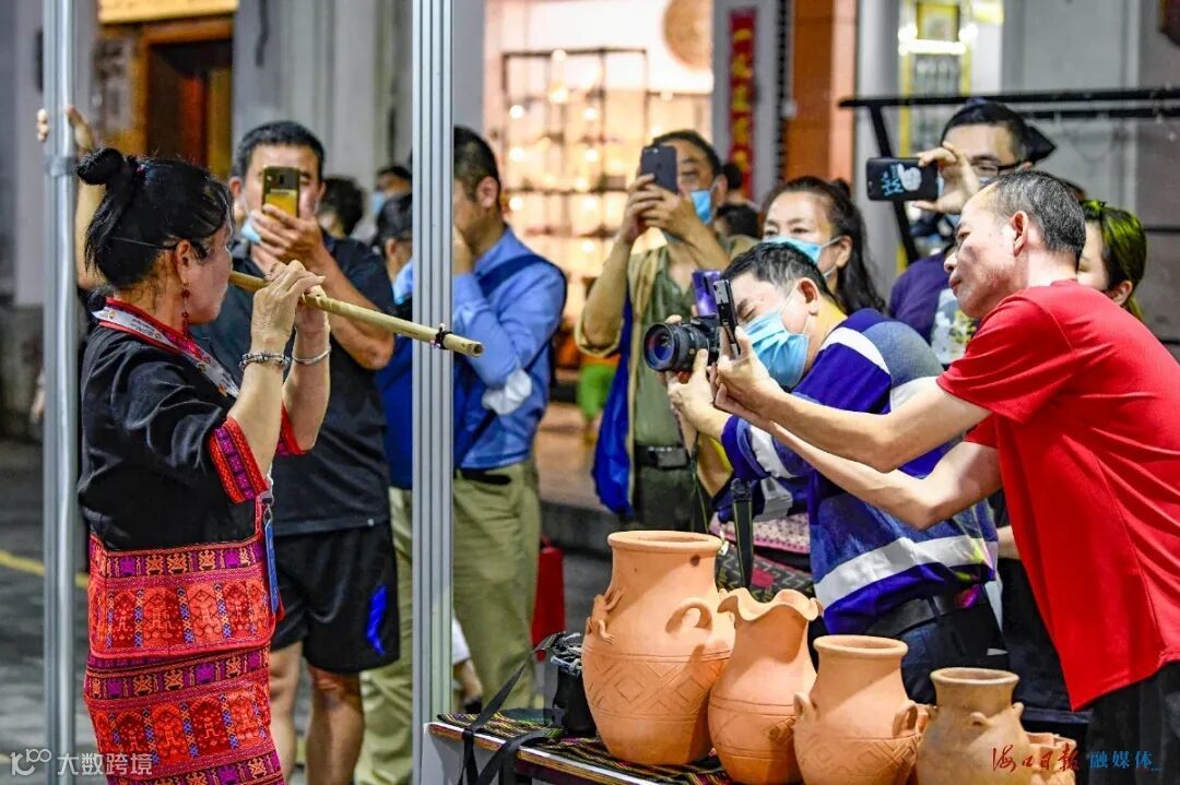 穿着黎族特色服装的艺人在海口骑楼老街“锦绣世界”艺术展上演奏鼻箫,吸引众多游客拍照。