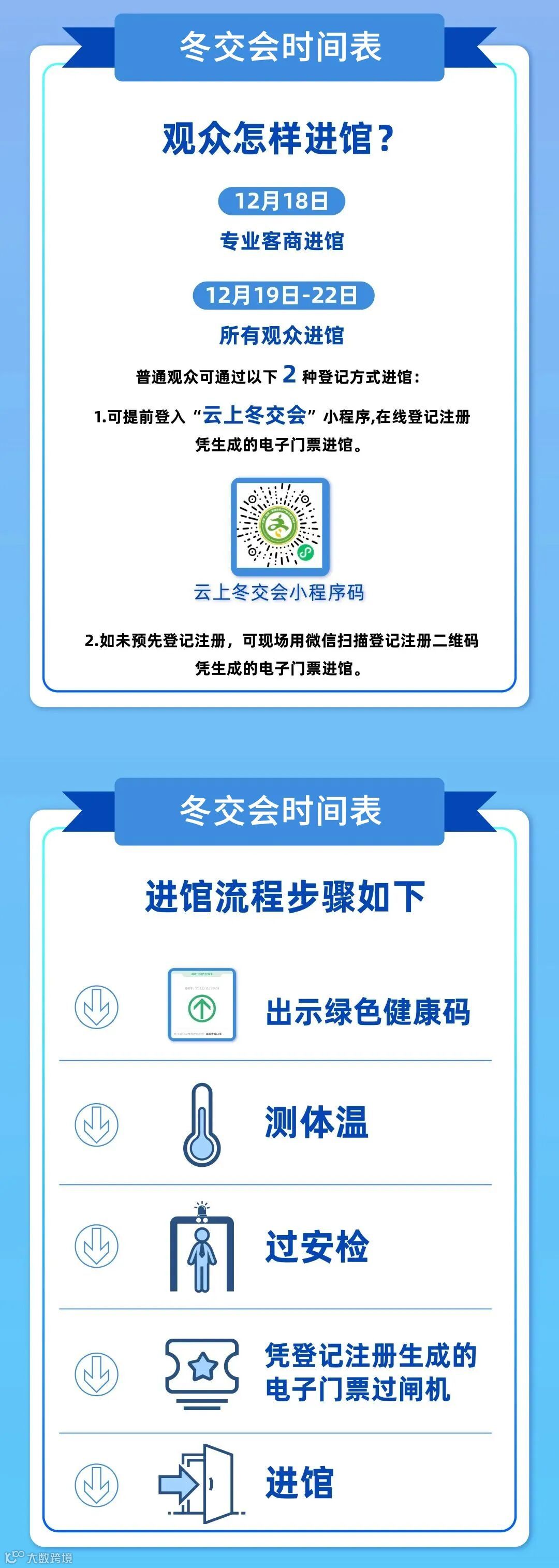 记者了解到,为做好疫情防控工作,保证2020年冬交会顺利安全举行,此次展会期间严格执行入场健康检测,对参展商采取入场查健康码(大数据行程码)→测温→安检→电子门票入场等,中高风险地区客商需提供7日内核酸检测报告,进馆需全程佩戴口罩。