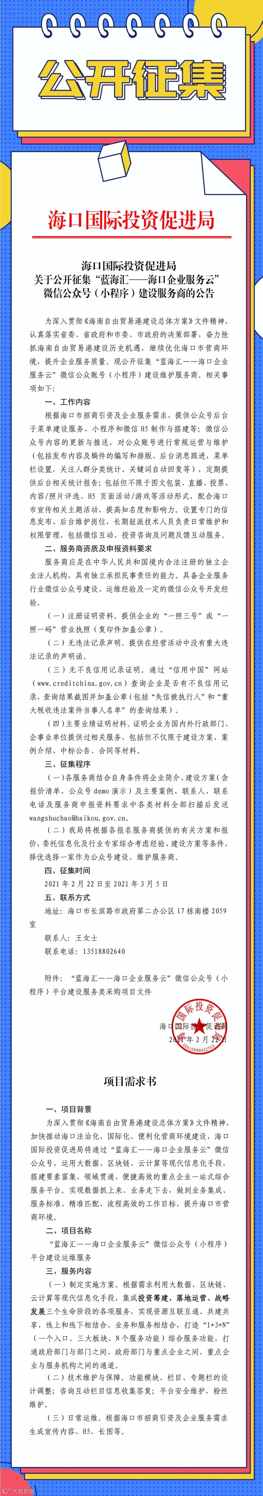 公开征集 | 海口国际投资促进局关于公开征集“蓝海汇——海口企业服务云”微信公众号(小程序)建设服务商的公告