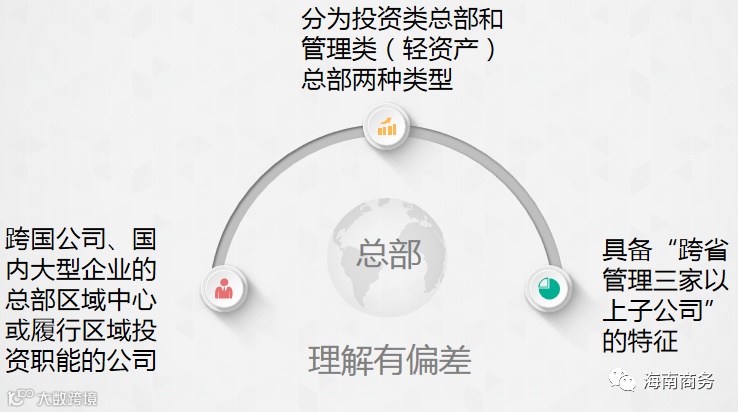 “总部”是有特定功能的,是指跨国公司、国内大型企业的总部区域中心或履行区域投资职能的公司,可以通过调度资本、技术和人才等资源,行使“总部”职权。“总部”分为投资类总部和管理类(轻资产)总部两种类型。目前有些地方对总部概念的运用有些泛滥,门槛过低,对“总部”的理解有偏差。有些企业提出要建亚太总部、华南区总部、南方区域总部等项目,其实只是想在海南设立一个公司,拿一块地,但具体做什么并不清楚。