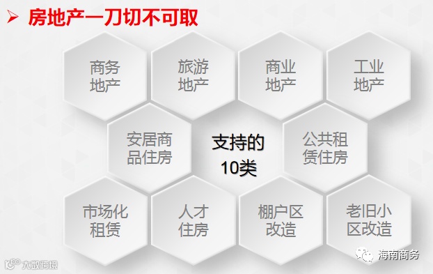 海南历史上曾经多次因为房地产投资炒作的问题引发大起大落,特别是上世纪90年代初,海南房地产经历了一轮高速发展,全国各地的人纷纷涌向海南“淘金”,“十万大军下海南,各大财团抢地盘”,海南的地产泡沫迅速膨胀。在全国实施宏观调控后,海南楼市一夜崩盘,烂尾楼遍地,经济受到重挫。因此,在建设自贸试验区、自贸港的新机遇面前,严控房地产泡沫成为海南经济发展的重要课题。这几年,海南省委省政府用“壮士断腕”的决心和勇气,来践行“房子是用来住的,不是用来炒的”理念,先是“多规合一”从规划源头进行控制,然后陆续实行“两个暂停”、“全域限购”,逐步减少对房地产的依赖。但是,严控房地产、防止历史教训重演,是一个循序渐进的过程,海南“不依赖房地产”,并不代表“绝不建房地产”,房地产是海南省发展的十二大重点产业之一。海南对房地产业是有保有压的,普通商品住宅要控制,对于商务地产、旅游地产、商业地产、工业地产、安居型商品住房、公共租赁住房、市场化租赁住房、人才住房、棚户区改造、老旧小区改造等十类房地产,是大力支持的,是鼓励招商引进的,所以招商同志不要“谈房地产色变”,拒绝任何房地产项目的谈判,这样“一刀切”的做法是片面和错误的。