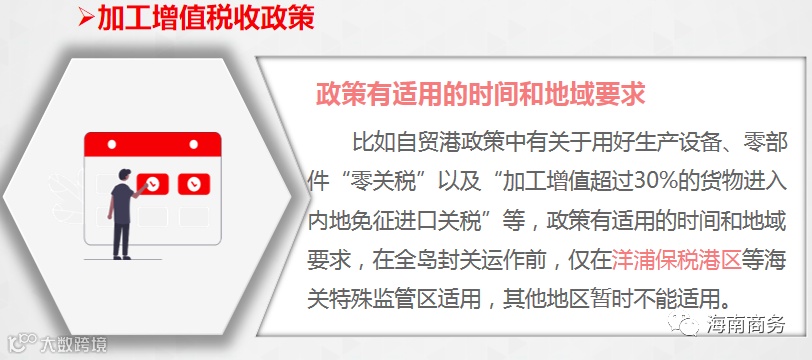 海南自贸港总体方案中有关于“加工增值超过30%的货物进入内地免征进口关税”的政策,这个政策有几个关键点需要把握,一是对鼓励类的企业适用,不是所有的企业。二是政策有适用时间和地域要求,在全岛封关运作前,仅在洋浦保税港区率先实行,其他地区暂时不能适用。