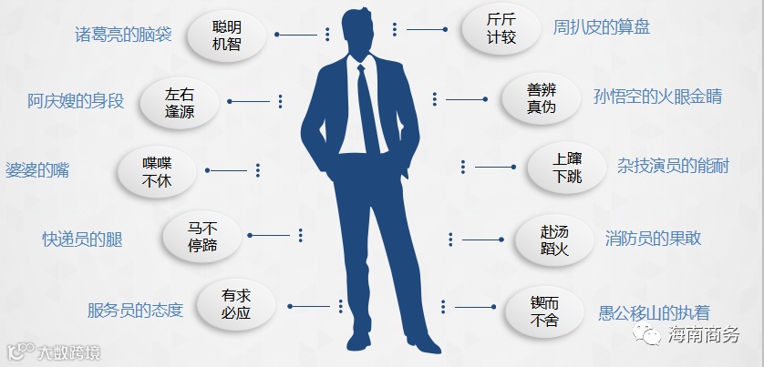 招商和企业服务人员一是要有诸葛亮的脑袋,聪明机智;二是要有阿庆嫂的身段,左右逢源;三是要有婆婆的嘴,喋喋不休;四是要有快递员的腿,马不停蹄;五是要有服务员的态度,有求必应;六是要有周扒皮的算盘,斤斤计较;七是要有孙悟空的火眼金睛,善辨真伪;八是要有杂技演员的能耐,上蹿下跳;九是要有消防员的果敢,赴汤蹈火;十是要有愚公移山的执着,锲而不舍。