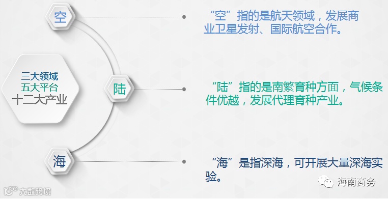 海南自贸港政策涉及方方面面,招商的时候应该要突出重点产业,更多地立足海南独特的资源禀赋来招商,以实现与国内其他省市(地区)的互补性、差异化发展。海南有哪些领域是能够充分利用独特资源又符合产业发展方向,今后还很有发展潜力的呢?除了常说的旅游业、高新技术业、现代服务业三大产业,还可以归结为“海陆空”三个方面,加上热带高效农业。