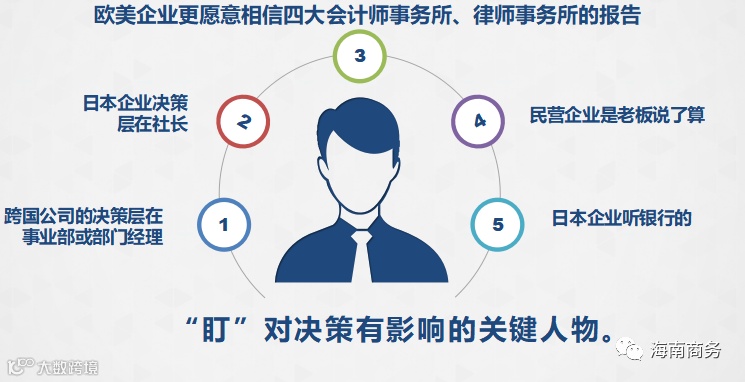 俗话说,知己知彼百战不殆。精准定位招商对象的特性非常重要,这样才能把有限的时间和精力“用在刀刃上”。比如要了解跨国公司的管理风格,他们内部分工很细,决策很多在事业部,有许多业务如数据输入、文件管理、人力资源管理、风险管理、金融分析、软件研发等都可能外包出去。民营企业是老板说了算,副总说了不管用,就是老板一个人拍板。日本企业决策在社长、取缔役,日本企业听银行的,银行提供的分析报告、决策建议很重要;企业很少走破产清算的路子,可以说“死要面子”,撑不下去也不破产。欧美企业更愿意相信四大会计师事务所、律师事务所、摩根斯坦利、高盛、麦肯锡等投资咨询公司的报告;有的欧美企业,明明集团内部已经有决策意见,但还是依赖第三方评估机构的报告或建议。
