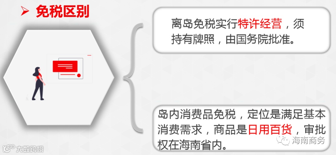 自贸港“零关税”政策的早期收获有两项很重要的制度设计,一个是岛内居民消费品的免税,另一个是离岛免税购物。经常有同志把这两种免税概念混淆。两者的区别其实比较明显,离岛免税政策是针对乘坐飞机、火车、轮船离岛的旅客,每年每人购物额度为10万元,商品种类限定在45种,离岛免税店铺实行特许经营,企业首先要获得免税经营牌照,然后提出开设免税店的申请,获批后才可开业经营。岛内居民消费品的定位是满足购物者生活和旅行的基本消费需求,主要是日用百货类消费品,在经营模式方面,店铺主要布局海南省的各社区、商业街区、临街铺面等,经营者不设置准入限制,达到准营条件即可。日用消费品的清单范围与离岛免税商品清单存在部分重叠,日用消费品清单范围更宽,包括63个大类,种类上多于离岛免税商品,能满足各层次的日用消费需求。