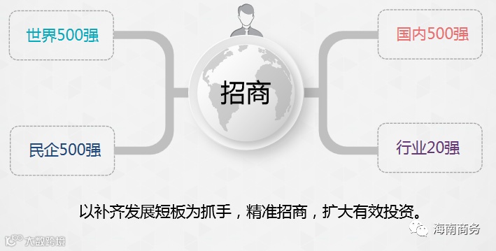 补短板招商的另一层意思,是针对地方产业的发展短板,靶向发力、精准招商。以海南为例,目前海南还存在不少短板,引进项目“国际化程度不够高”就是其中的短板之一。去年海南省实际利用外资虽然达到15亿美元,但也仅仅是上海的8.2%、深圳的19.3%。外资增速上,海南虽然比上海和深圳高,但是绝对数来讲,还是小学生和大学教授的区别。而且已经引进的企业层次不够高,目前进驻海南省的世界500强企业(包括过去上过榜如今已不在榜中的企业)共104家。而其他省份中,江苏有389家,湖南有175家,上海和北京几乎所有的500强企业都有进驻或有项目。当下,海南已经步入自贸港建设阶段,招商工作中要树立国际化的视野和战略眼光,加强对世界500强,国内500强、民企500强、行业20强等“大块头”企业的招商,精心谋划高标准、高质量的项目,“主动出击”、主动上门对接。特别是世界一流的企业,需要我们主动上门请,他们才会开展研究、进行可行性论证,耗时可能比较长,但是一旦决定投资建设,做一件就是一件精品。当然,其他企业也不能忽略,要把握好“抓大不放小”“喜新不厌旧”“重硬不轻软”“求远不舍近”的原则,补齐短板、精准招商,扩大有效投资。