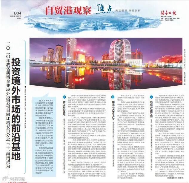 1月27日出版的海南日报B04版自贸港观察·焦点聚焦《海南自由贸易港建设总体方案》发布以来,我省各项政策红利逐步落地,海南掀起了新的投资热潮。