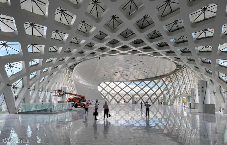 据介绍,海南国际会展中心二期项目与一期项目相邻而建,总建筑面积约为20.18万平方米,其中室内展览面积约7.5万平方米。项目共分为北馆与南馆,其中北馆一层包括1个1.35万平方米的精品展厅以及9个会议室,二层有1个0.42万平方米的中型会场,4个会议室;南馆则有4个约1.2万平方米的无柱展厅,地下车库可容2200余台车辆共同停放。