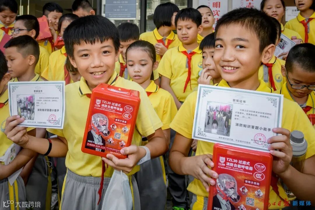 在美兰区新时代文明实践中心, 美兰区消防教育体验馆正式开馆,图为前来参加活动的海口市第三十四小的两名同学,在向记者展示他们在竞答环节拿到的奖状及礼品。 陈长宇 摄