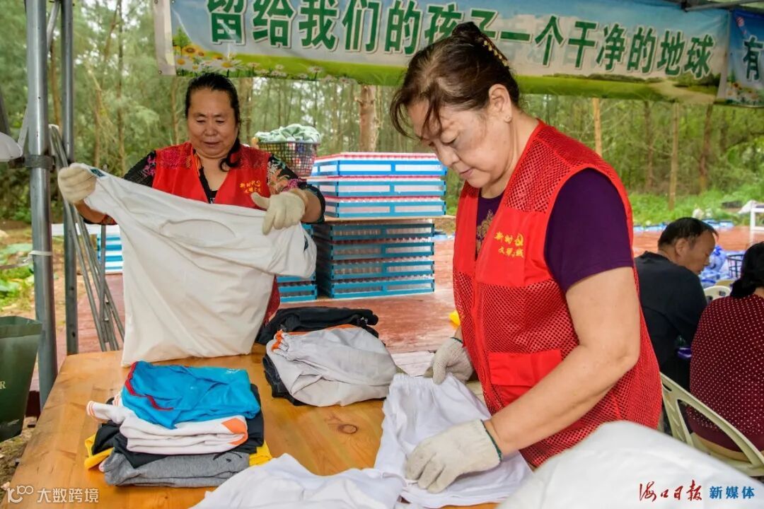 10月28日上午,两名候鸟老人在白沙门环保教育站将收集来的废弃衣物叠好。