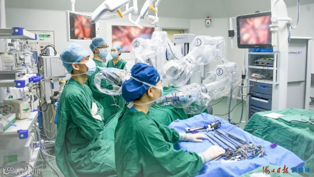 在海口市人民医院,主刀医师通过“达芬奇”机器人的医生控制台,为患者进行手术治疗。 陈长宇 摄