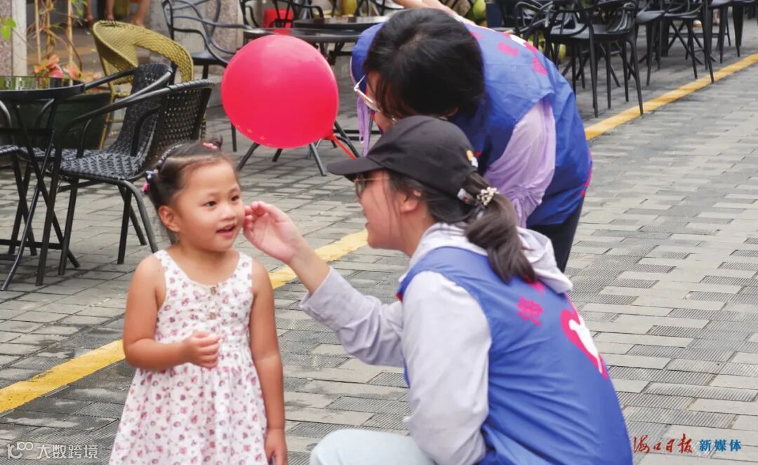 国庆中秋假期,志愿者开展文明引导志愿服务活动,为小游客贴上国庆主题贴纸。图片来源:海口市志愿服务联合会