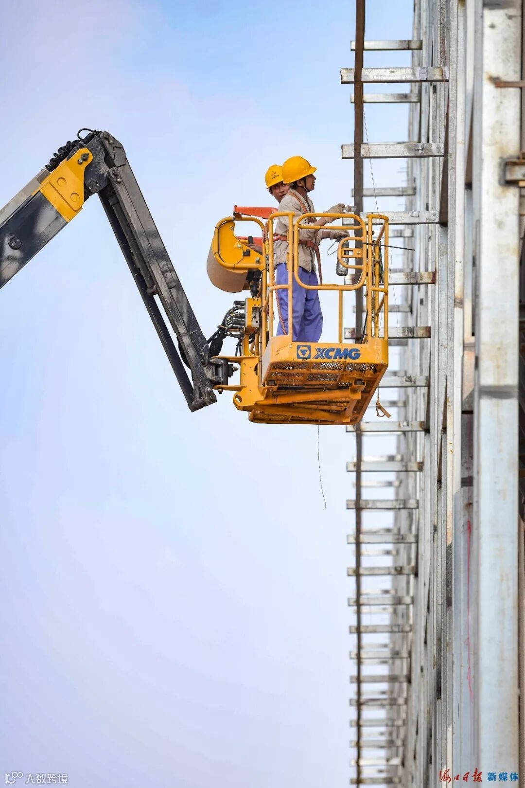 11月2日,在位于海口江东新区临空经济区的美兰空港一站式飞机维修基地项目工地,机械轰鸣,工人在安装厂房幕墙。 王程龙 摄