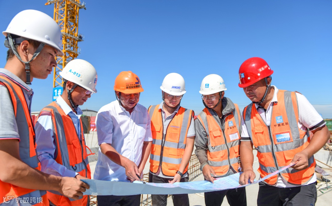 在海南国际能源交易中心项目现场,建设者们讨论施工方案。王程龙 摄