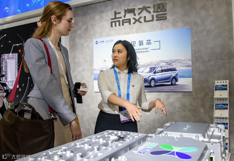 2020世界新能源汽车大会在海南国际会展中心二期举行,图为大会展厅内,外宾在听取上汽集团工作人员对氢能发动机的介绍。陈长宇 摄