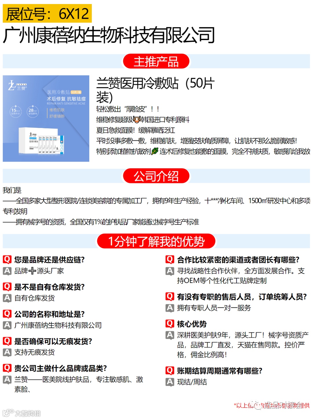 选品对接会公司介绍:是——全国多家大型整形医院/连锁美容院的专属加工厂,拥有9年生产经验,十***净化车间、1500㎡研发中心和多项专利发明
