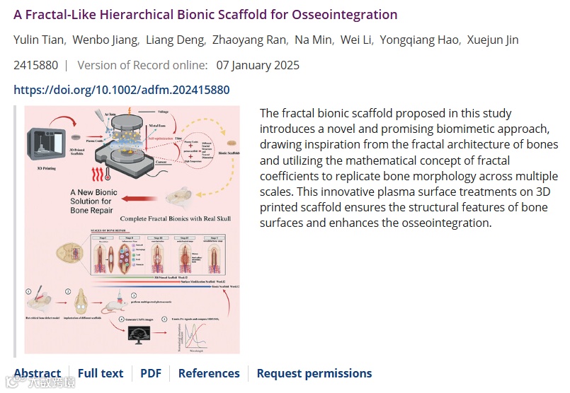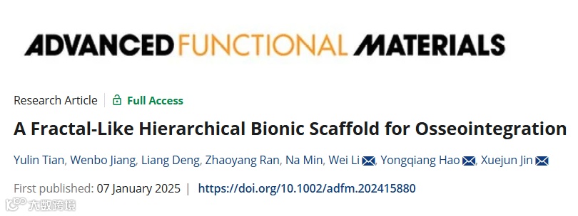 Yulin Tian, Wenbo Jiang, Liang Deng, Zhaoyang Ran, Na Min, Wei Li, Yongqiang Hao, Xuejun Jin, 07 January 2025, A Fractal-Like Hierarchical Bionic Scaffold for Osseointegration. https://doi.org/10.1002/adfm.202415880