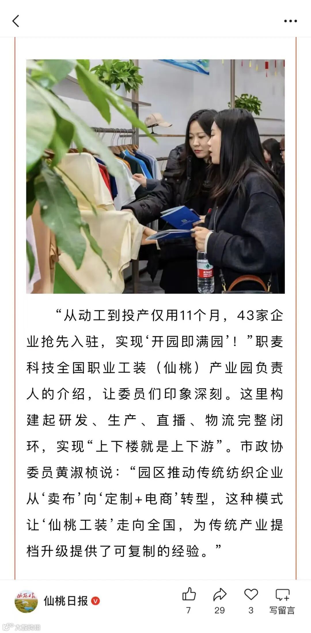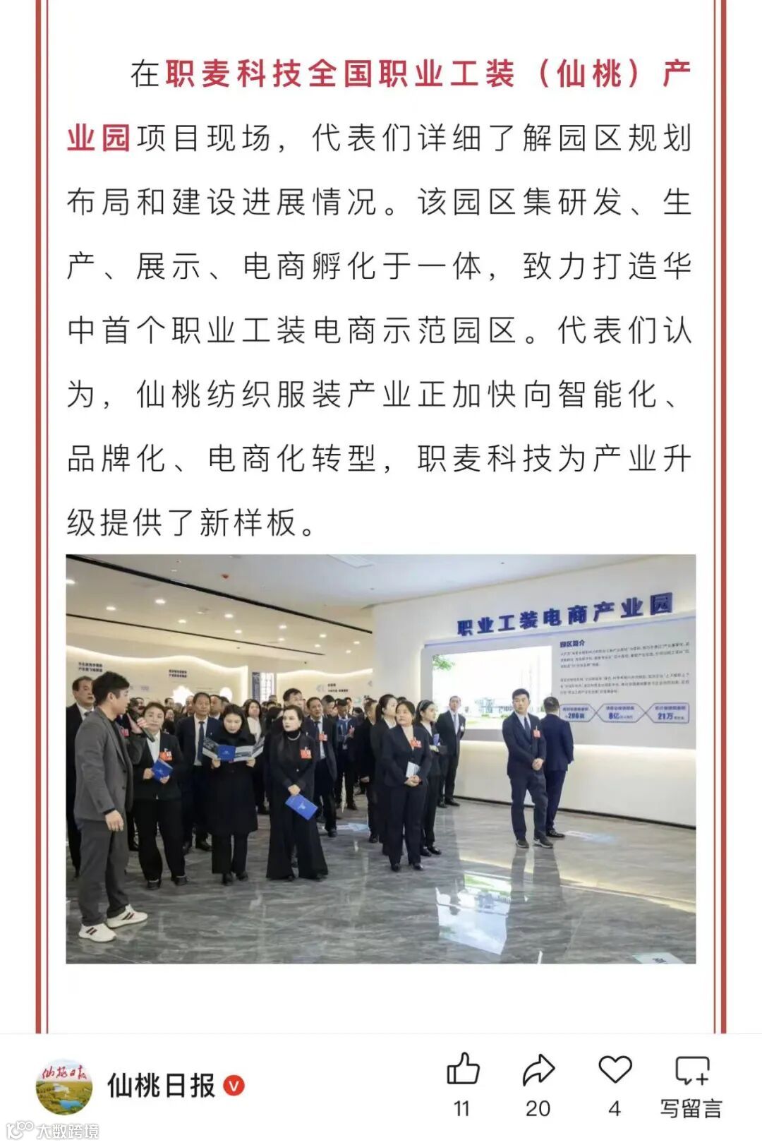 此次政协委员、人大代表的参观考察,既是对职业工装电商产业园阶段性发展成果的肯定,也为园区下一步发展指明了方向。职业工装电商产业园将进一步优化园区运营服务,加快产业链协同创新,努力将园区建设成为仙桃市产业转型的示范窗口、就业创业的重要平台、对外合作的亮丽名片。