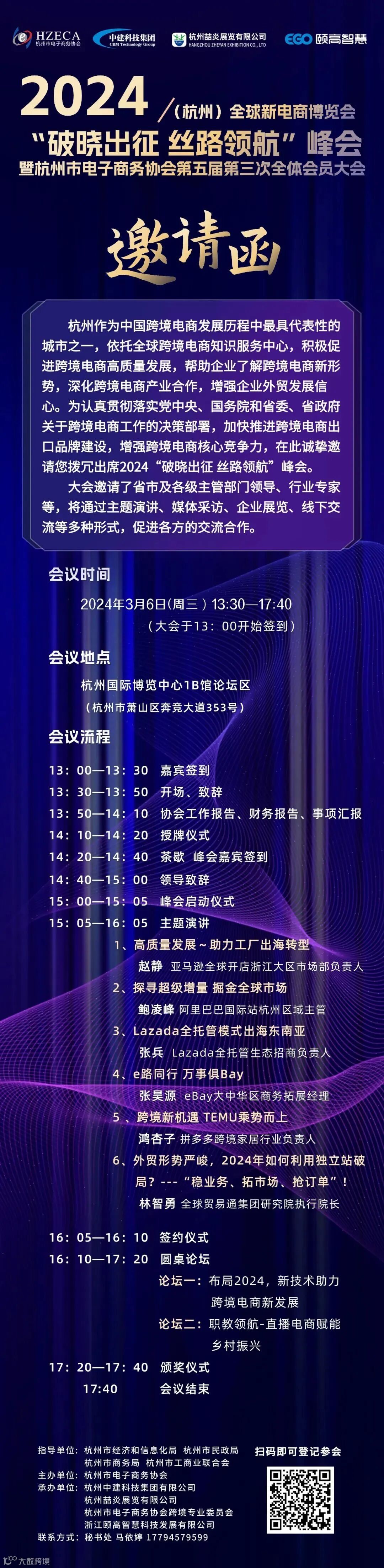 大会由杭州市经济和信息化局、杭州市民政局、杭州市商务局、杭州市工商业联合会指导,杭州市电子商务协会主办,杭州中建科技集团有限公司、杭州喆炎展览有限公司、杭州市电子商务协会跨境专业委员会、浙江颐高智慧科技发展有限公司承办。本届峰会设置为开幕式+主论坛+两场圆桌论坛,特邀亚马逊、阿里巴巴、Lazada、eBay、TEMU、全球贸易通集团等行业专家,核心围绕跨境电商高质量全球化发展,聚焦双循环新发展格局,探讨“一带一路”战略下,中国跨境电商迈向世界的更多可能性与潜在商机。