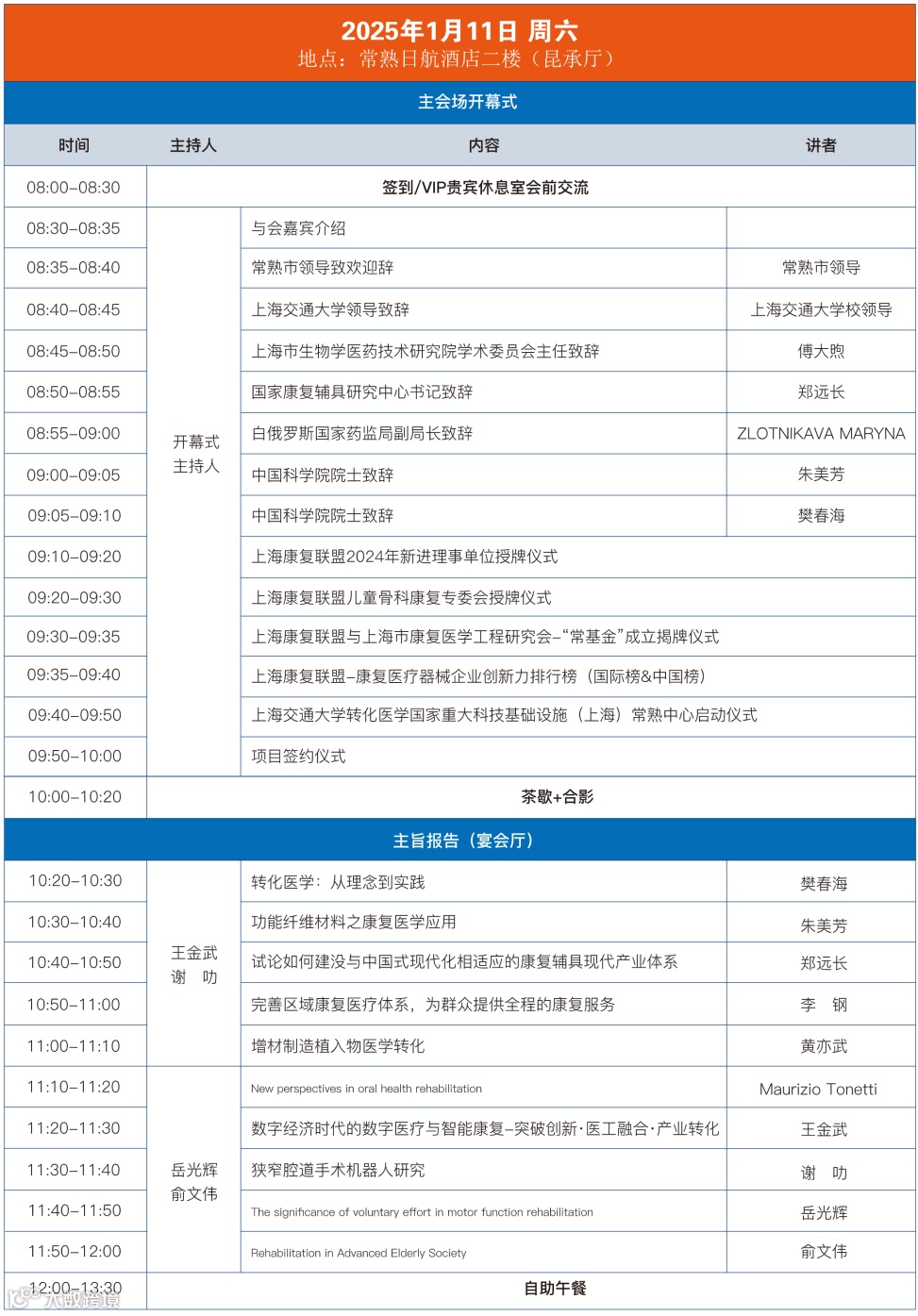 出席本次大会的嘉宾有中国科学院院士樊春海先生;中国科学院院士朱美芳女士;上海交通大学医学院第九人民医院口腔颅面及感官综合健康研究院院长托内特先生;白俄罗斯国家药监局副局长兹洛特尼阔娃女士;白俄罗斯国家药监局医疗中心主任阿塔马诺娃女士;葛洛多诺急救医院院长菲利波维奇先生;大会主席、上海交通大学医学院附属第九人民医院骨科主任医师王金武先生;大会主席、上海交通大学国家数字化制造技术中心教授、博士生导师谢叻先生;民政部国家康复辅具研究中心党委书记郑远长先生;上海市生物学医药技术研究院学术委员会主任傅大煦先生;上海交通大学转化医学研究院书记张显明先生;滨州医学院正校级领导李文喜先生;山东省产教融合促进会专家委员会主任李斌先生;中国海洋航空集团有限公司副总经理、总法律顾问、首席合规官徐昭曦先生;中国海洋航空集团有限公司副总经理范弋先生中国海洋航空集团有限公司总经理助理、董事会秘书、战略运行部总经理龚志勇先生;中国海洋航空集团有限公司外派董事长李志芳女士;上海市食品药品监督管理局医疗器械监管处副处长黄亦武先生;美国凯斯勒康复研究基金会和凯斯勒康复医院运动与康复工程研究中心主任岳光辉先生;千叶大学先端医工学中心、千叶大学大学院融合理工学府教授俞文伟先生;上海交通大学转化医学研究院副院长孙洁林先生;上海市科委院士中心项目研究部部长袁硕颀先生;上海市康复医学工程研究会常务副秘书长范权先生;人民日报社(健康时报)高级编辑赵广泉先生;常熟市委副书记、市长张伟先生;常熟市委常委、高新区党工委书记王建国先生;常熟高新区党工委副书记、管委会副主任须亚军先生;常熟国家大学科技园党工委副书记、管委会主任王奇峰先生;常熟国家大学科技园党工委委员、管委会副主任潘伟先生;同时,今天参加大会的嘉宾还有高校和医疗机构康复医学领域的高层次专家学者、优秀青年人才代表、优质企业代表,以及常熟市、常熟高新区相关部门负责人等。