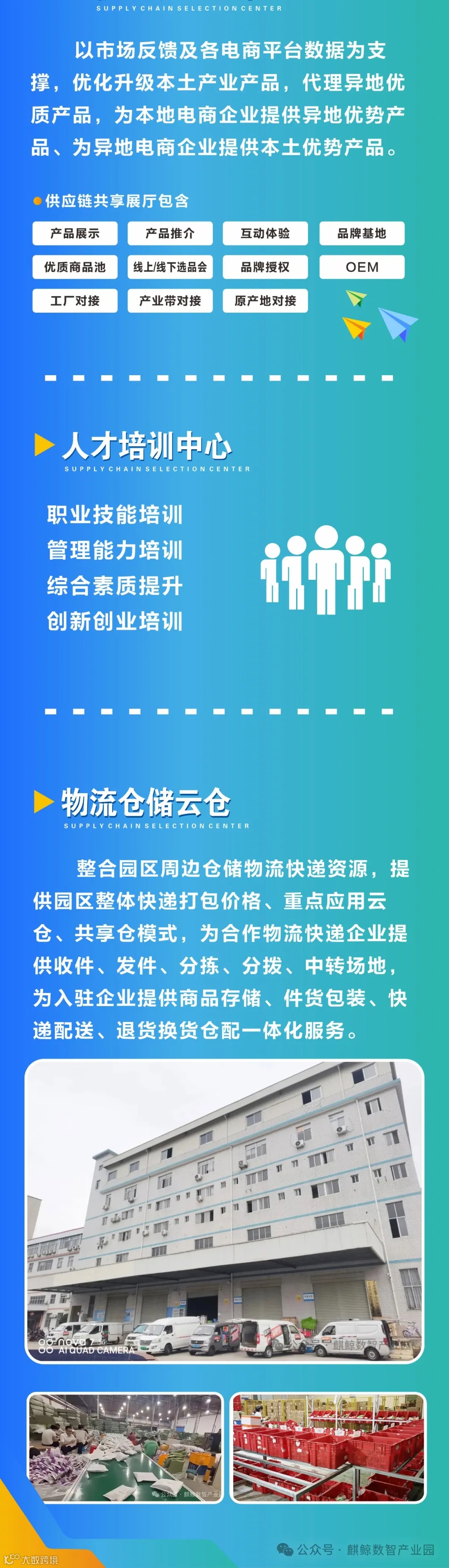 麒鲸数智商家服务中心,秉持共创、共享、共赢的经营理念,为创业者提供一站式服务:从办公、技能培训,到内容制作、营销渠道构建,再到供应链选品,全方位助力。