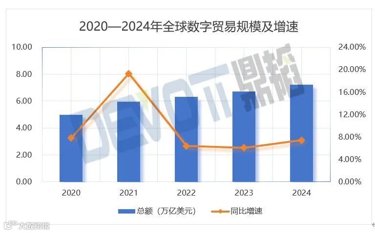 根据鼎韬发布的最新数据,2024年全球数字贸易规模达到7.22万亿美元,展现出强劲活力。与2020年的4.99万亿美元相比,四年间增长了44.74%,年度复合增长率(CAGR)达9.69%。2024年,全球数字贸易规模同比增长7.45%,高于全球商品和服务出口整体增速(4.43%)3.02个百分点,占全球商品和服务出口总额的比重也提升至21.73%。