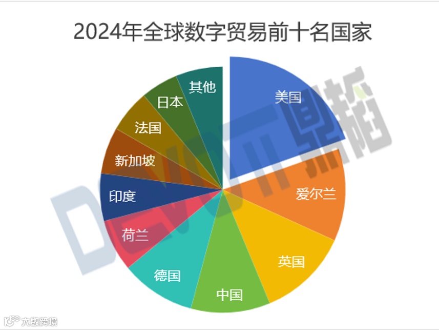 荷兰、印度、新加坡、法国、日本则分别位居全球第六至十位,全球数字贸易规模前十名国家的数字贸易规模总和占比高达93.81%。