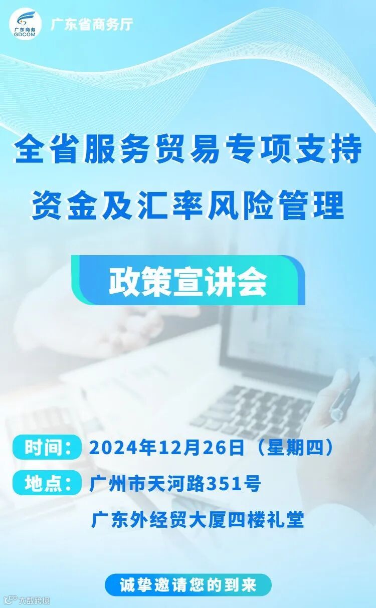为支持服务贸易企业创新发展,增强企业汇率风险管理意识,支持、指导企业有效面对汇率变化遇到的困难和问题,广东省商务厅联合国家外汇管理局广东省分局定于12月26日举办全省服务贸易专项支持资金及汇率风险管理政策宣讲会。