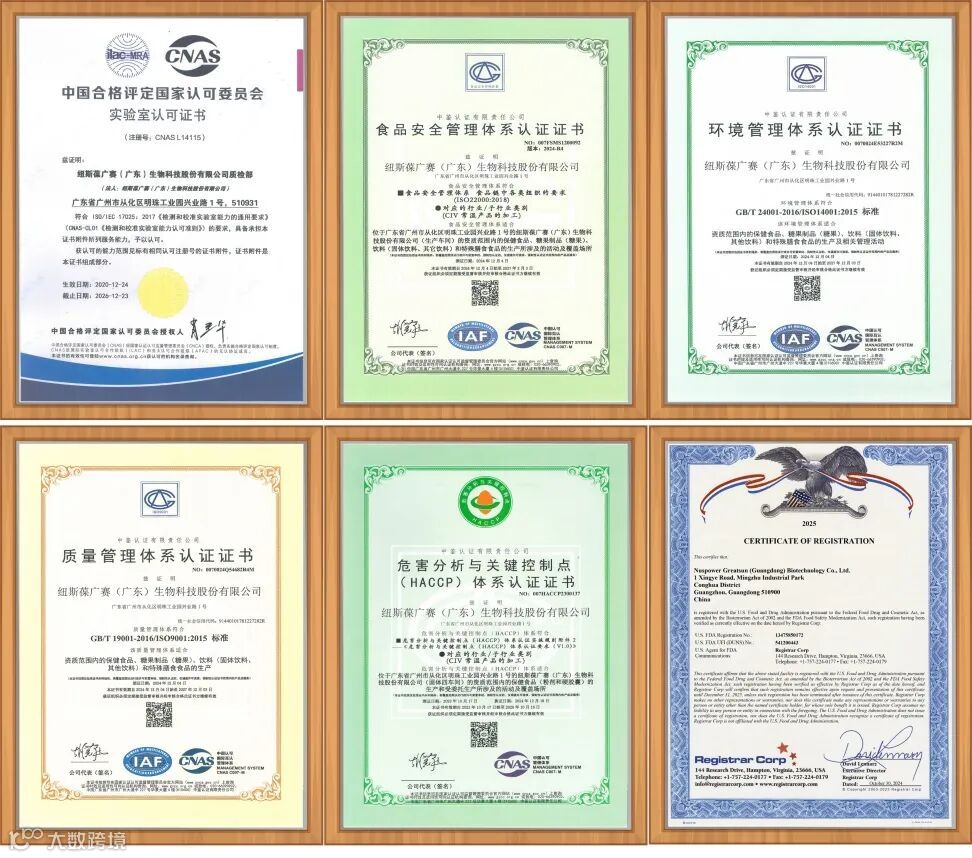 纽斯葆广赛具备ISO9001、ISO22000、ISO14001、HACCP体系认证、CNAS实验室认可、FDA注册、NSF 455-2GMP认证、HALAL认证等多项合规资质。同时重视研发创新,累计荣获65+项国家授权专利,以技术硬实力夯实企业护城河,赋能合作客户抢占市场先机,并在2025年新增8项发明专利。