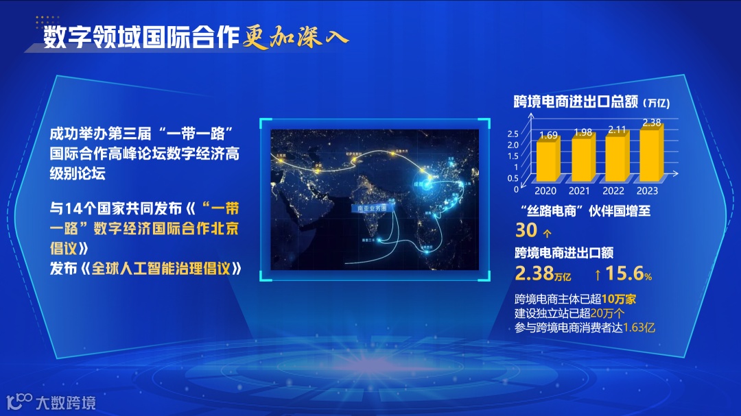 《报告》指出,数据安全制度体系基本形成,出台全球首部专门规范生成式人工智能服务的规章——《生成式人工智能服务管理暂行办法》。积极拓展数字领域国际合作,成功举办第三届“一带一路”国际合作高峰论坛数字经济高级别论坛等,我国“丝路电商”伙伴国增加到30个,