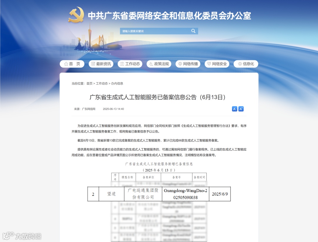 6月13日,广东网信办发布的《广东省生成式人工智能服务已备案信息公告》显示,新增广电运通望道大模型等13款生成式人工智能服务备案。这标志着望道大模型在模型安全与合规性上获得权威认可,为公司在金融、政务等关键行业的规模化商业应用奠定了坚实基础。