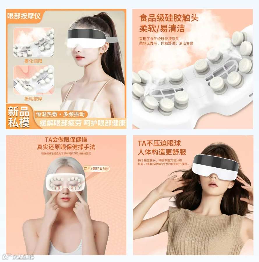 眼部雾化蒸汽振动按摩仪:采用纳米蒸汽,点对点按摩,滋润眼睛,准确有效地保护双眼,解决眼球膨胀的疲劳,不压迫眼球更舒服,16个大触点,立体振动按摩覆盖眼部周围穴位,改善微循环,TA拥有手指般的按摩体验。TA还是一台润眼仪,眼干眼涩直接补水,纳米级蒸汽润眼,眼部SPA,还你水汪汪的初恋眼。四大模式全方位护眼,边按摩边听音乐加倍放松,食品级硅胶触头,柔软易清洁。