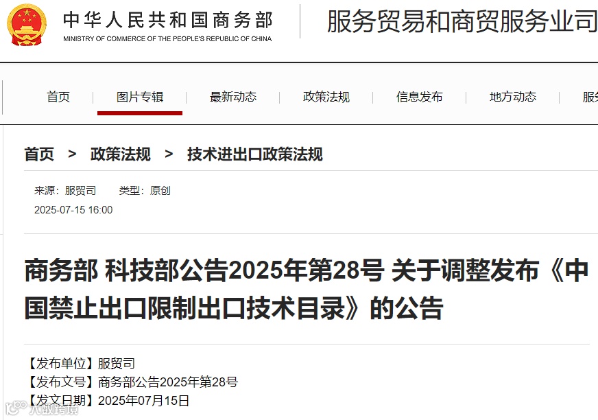2025年7月15日,商务部会同科技部调整发布《中国禁止出口限制出口技术目录》,其中: