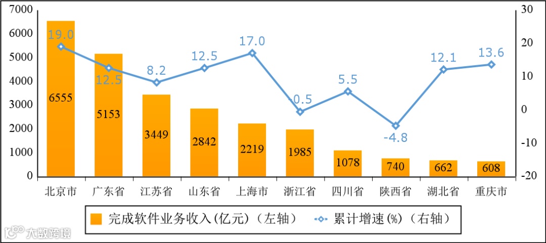 主要软件大省收入占比持续提升。一季度,软件业务收入居前5名的省份中,北京、广东、江苏、山东、上海软件收入分别为6555亿元、5153亿元、3449亿元、2842亿元和2219亿元,分别增长19.0%、12.5%、8.2%、12.5%和17.0%,五省(市)合计软件业务收入20218亿元,占全国比重为72.2%,占比较去年同期提高1.5个百分点。