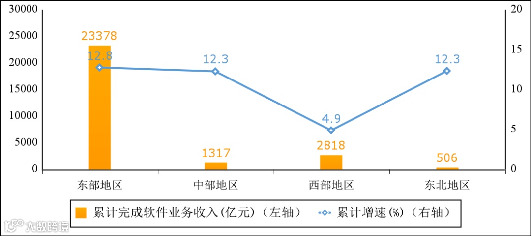 中部、东北地区软件业务收入增速加快。一季度,东部地区完成软件业务收入23378亿元,同比增长12.8%;中部地区完成软件业务收入1317亿元,同比增长12.3%,增速较1—2月份提高15.7个百分点;西部地区完成软件业务收入2818亿元,同比增长4.9%,增速较1—2月份回落0.3个百分点;东北地区完成软件业务收入506亿元,同比增长12.3%,增速较1—2月份提高1个百分点。四个地区软件业务收入在全国总收入中的占比分别为83.4%、4.7%、10.1%和1.8%。