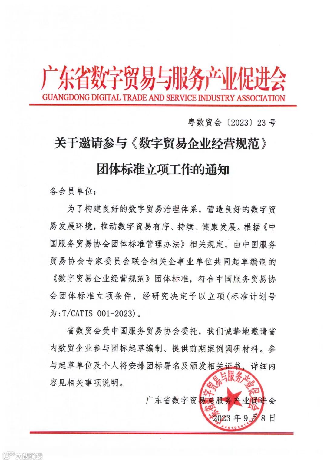 关于邀请参与《数字贸易企业经营规范》团体标准立项工作的通知