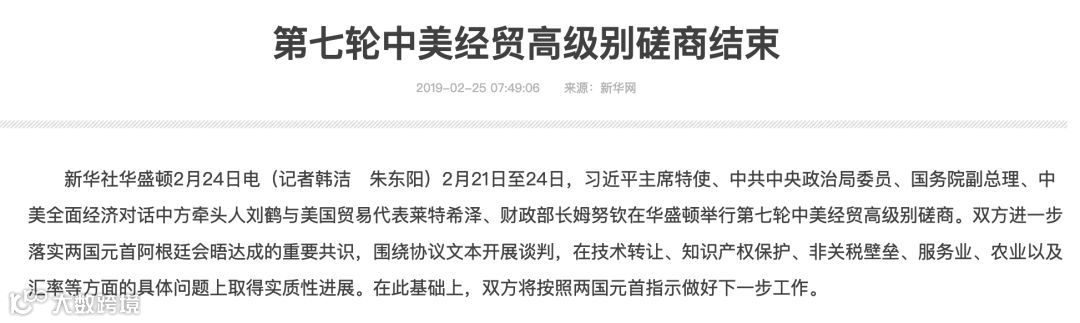 新华社报道指出,双方进一步落实两国元首阿根廷会晤达成的重要共识,围绕协议文本开展谈判,在技术转让、知识产权保护、非关税壁垒、服务业、农业以及汇率等方面的具体问题上取得实质性进展。在此基础上,双方将按照两国元首指示做好下一步工作。