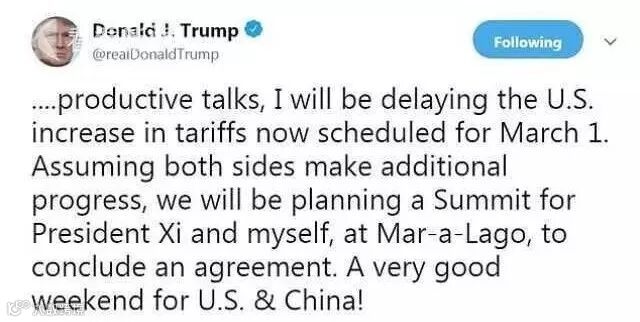 磋商结束后,美国总统特朗普在其推特账户上宣布,美国将推迟原定于3月1日上调对中国输美商品加征关税的计划。