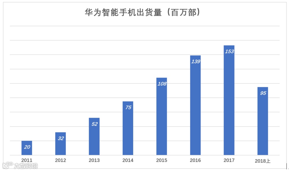 2018年上半年,华为智能手机出货量达9500万部,全年出货2.08亿部,居全球第三。排在华为前面的三星、苹果出货量分别为3.14亿部和2.25亿部。按照这种趋势,2019年华为智能手机出货量将超越苹果,稳居全球第二。