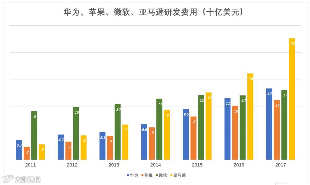 2017财年,华为、苹果、微软、亚马逊的研发投入分别为133亿美元、112亿美元、130亿美元和226亿美元。华为仅次于亚马逊。