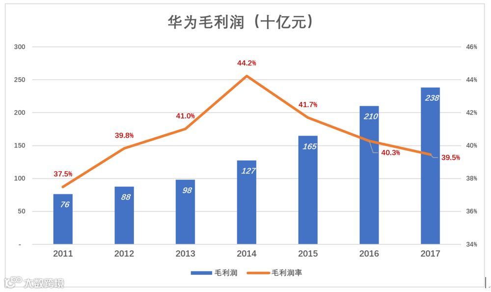 多重因素作用下,华为毛利润率拐点出现在2014年,为44.2%,绝对金额达1275亿。此后逐年下滑,2017年跌到39.5%,但绝对金额达2381亿。