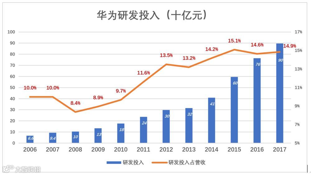 2006年~2017年,华为12年累计研发投入达4090亿,占同期总营收的13.2%。截至2017年末,华为研发人员达到8万人,占员工总数的45%。估计2018年研发投入超过1000亿,累计数量超过5000亿!