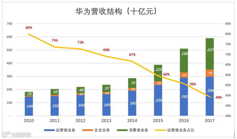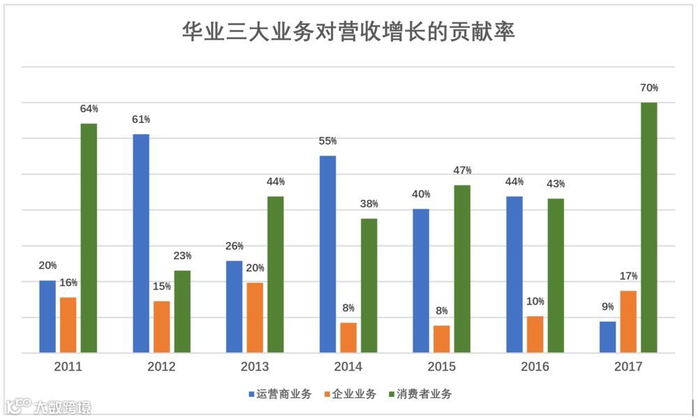 到了2017年,消费者业务贡献率达到70%,运营商业务只有9%,这种局面或许会成为常态。