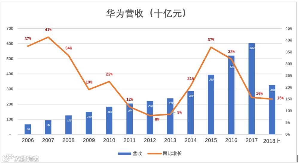 2007年华为营收增速达41%,受美国次贷所引发全球金融危机的影响,华为增速迅速下滑,2009年跌至19%。2011年反弹到22%之后,华为又度过了艰难的3年,营收增速在10%上下;2015年、2016年,华为再度迎来快速增长,增速分别为37%和32%;2017年急速回落到16%。