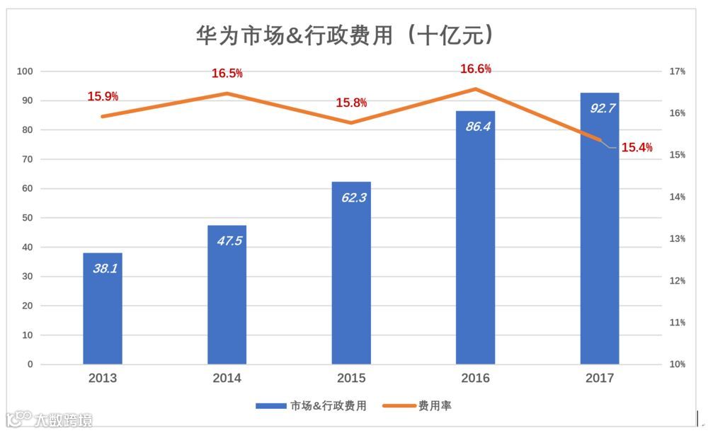 华为的厉害之处在于,转向过程中“市场&行政费用率”不升反降:2014年,市场及行政费用合计475亿,占营收的16.5%;2017年,市场及行政费用合计927亿,占营收的15.4%。